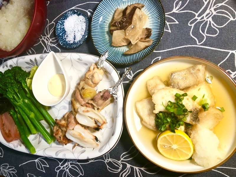 サラダ油で揚げた、タラと豆腐につゆをかける。大根おろしとスダチを添えて。
